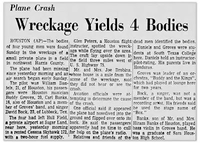 Glen Peters, a flight instructor from Houston, spotted the wreckage that Saturday morning. The aircraft lay upside down in a field in north Houston, about three miles west of Highway 75. The plane had apparently nosedived into the ground and flipped on impact. There were no survivors. Investigators would blame a defective fuel gauge.